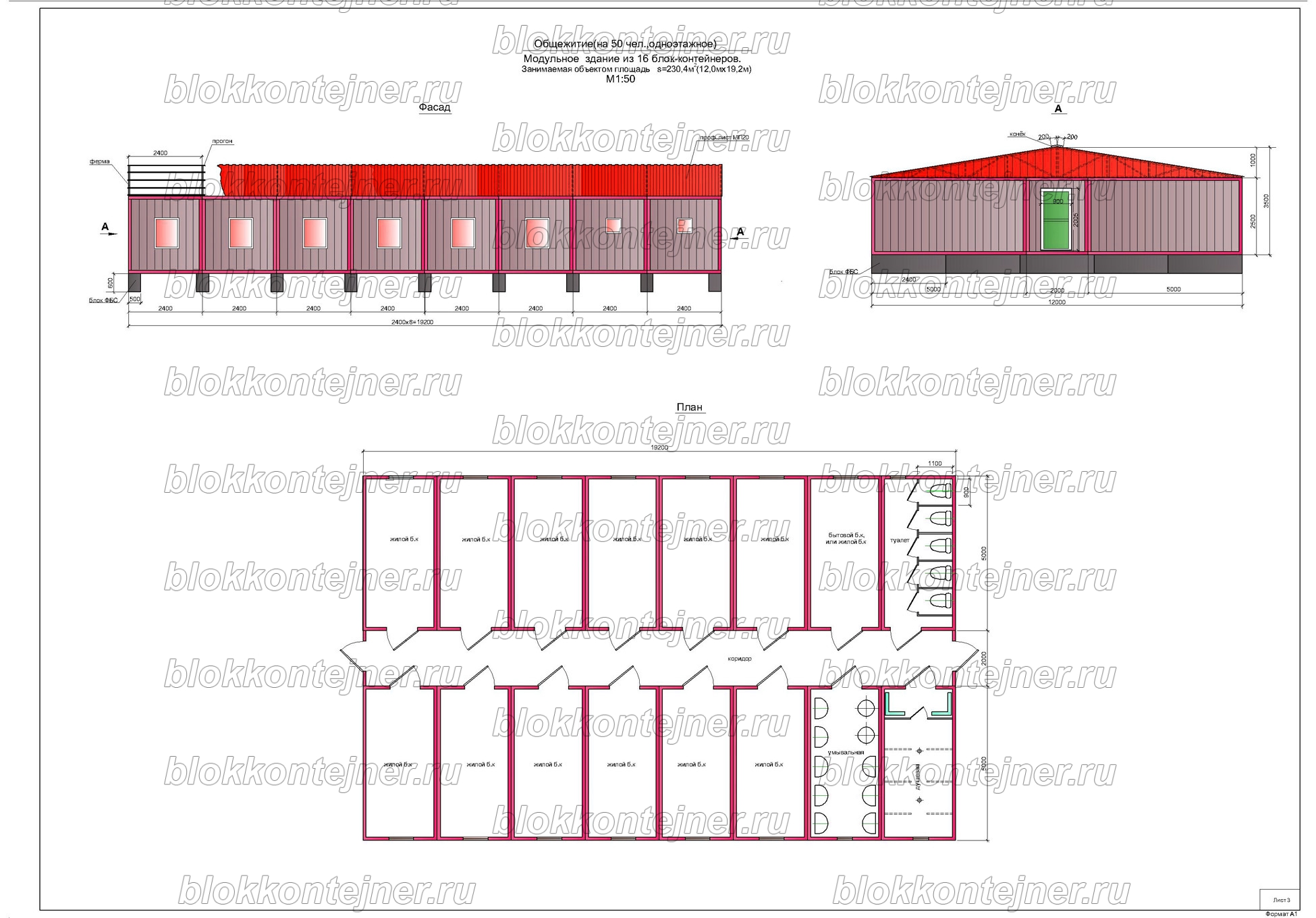 Общежитие на 50 человек, одноэтажное из 16 БК